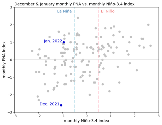 One-month-average Pacific-North America pattern index (vertical axis) versus the one-month-average NiƱo-3.4 index (horizontal axis) during Decembers and Januarys, 1950ā2022. Climate.gov graph from CPC data.