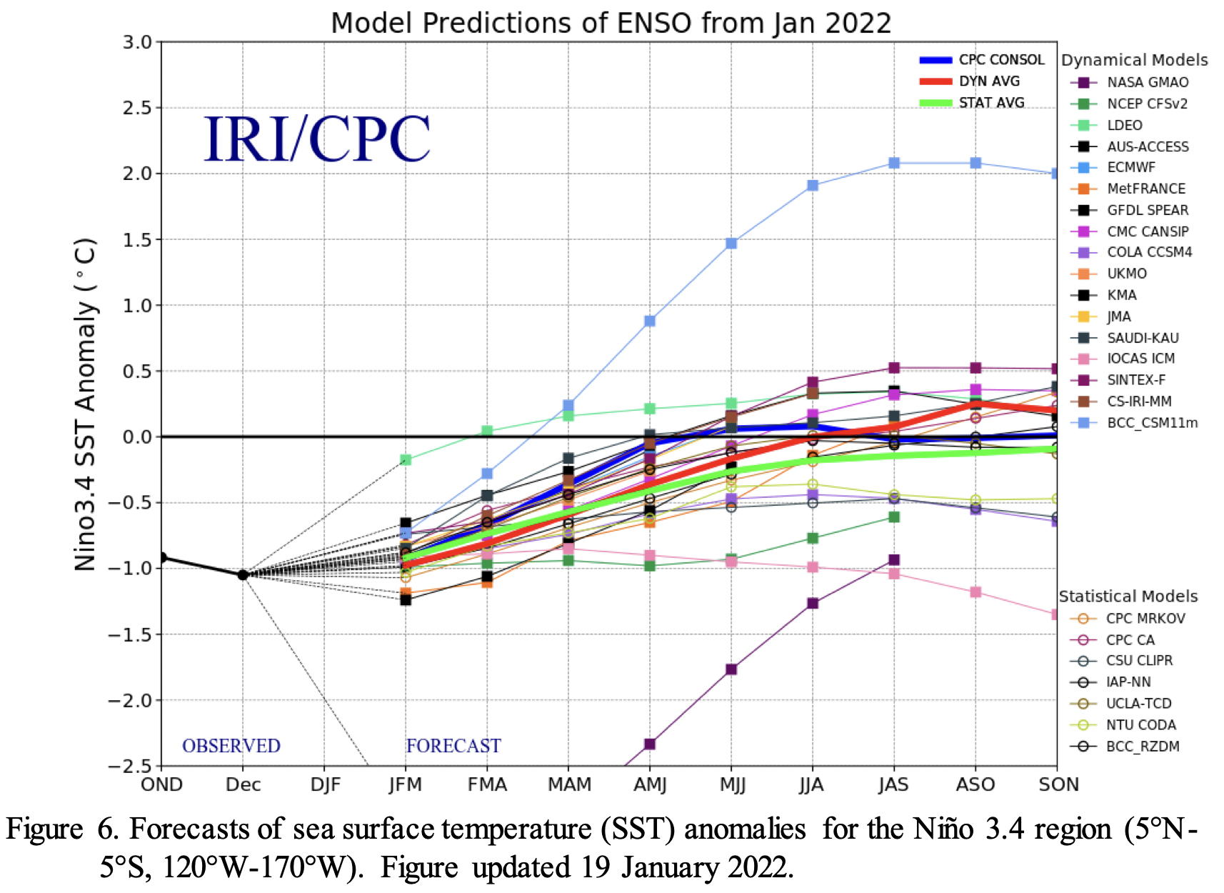 Synopsis: La NiƱa is likely to continue into the Northern Hemisphere spring (77% chance during March-May 2022) and then transition to ENSO-neutral (56% chance during May-July 2022).