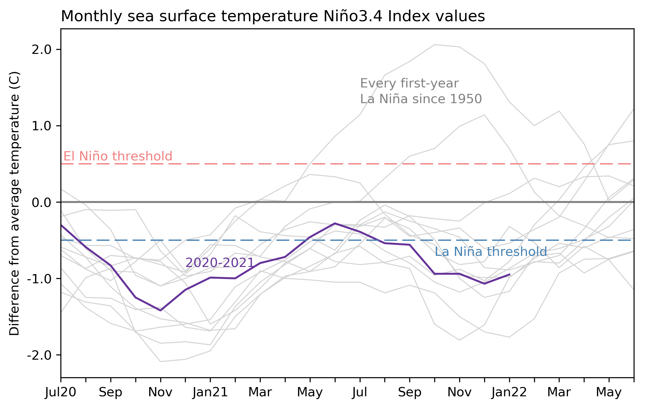 The NovemberāJanuary average Oceanic NiƱo Index, that is, the three-month-average sea surface temperature anomaly in the NiƱo-3.4 region of the tropical Pacific, was -1.0 °C. Anomaly means the difference from the long-term average; long-term is currently 1991ā2020. This marks our fifth three-month period in a row with an Oceanic NiƱo Index that exceeds the La NiƱa threshold of -0.5 °C. Passing this mile marker means this La NiƱa has persisted long enough to be awarded a bold blue color in our historical table. Congratulations, La NiƱa 2021ā22, already the second La NiƱa of this young decade.