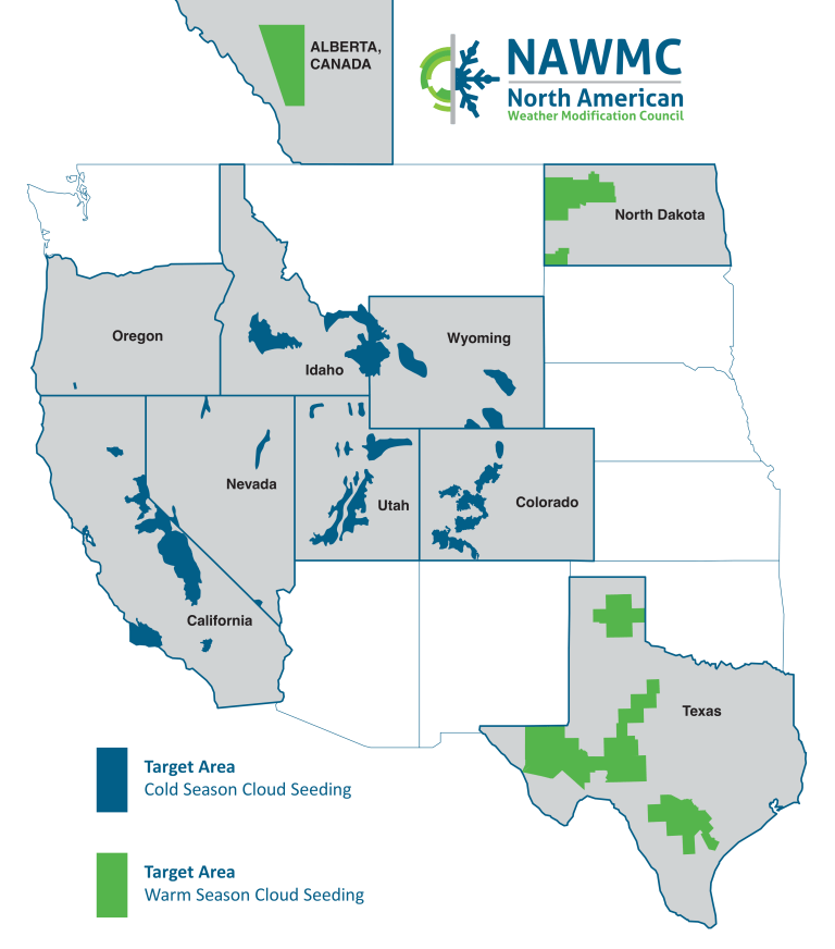 Cloud Seeding targets North America. Map credit: North American Weather Modification Council