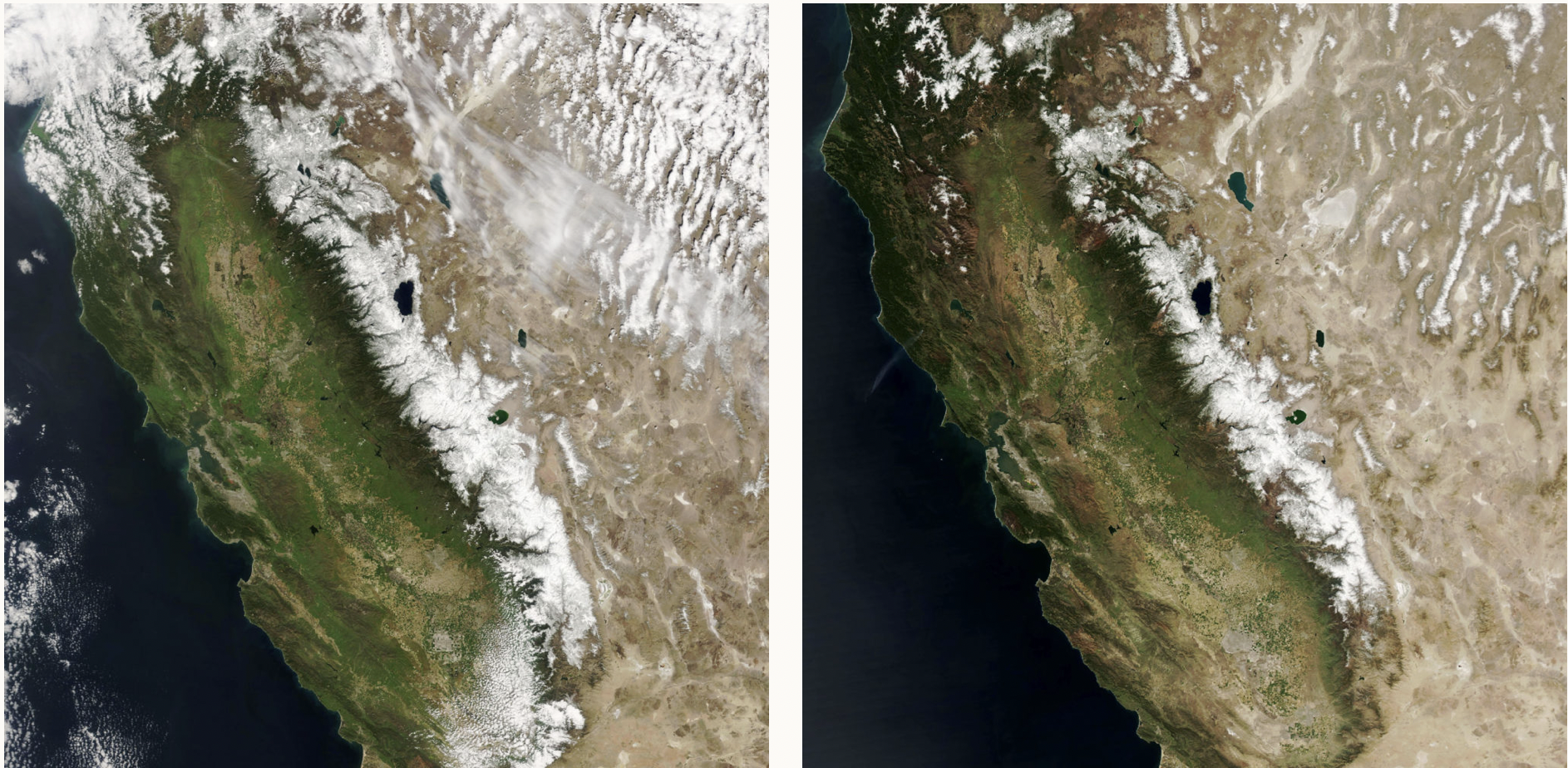 California’s Sierra Nevada mountains in March 2010 (left), a typical year for snowpack, and in March 2021 (right), a drought year. NASA