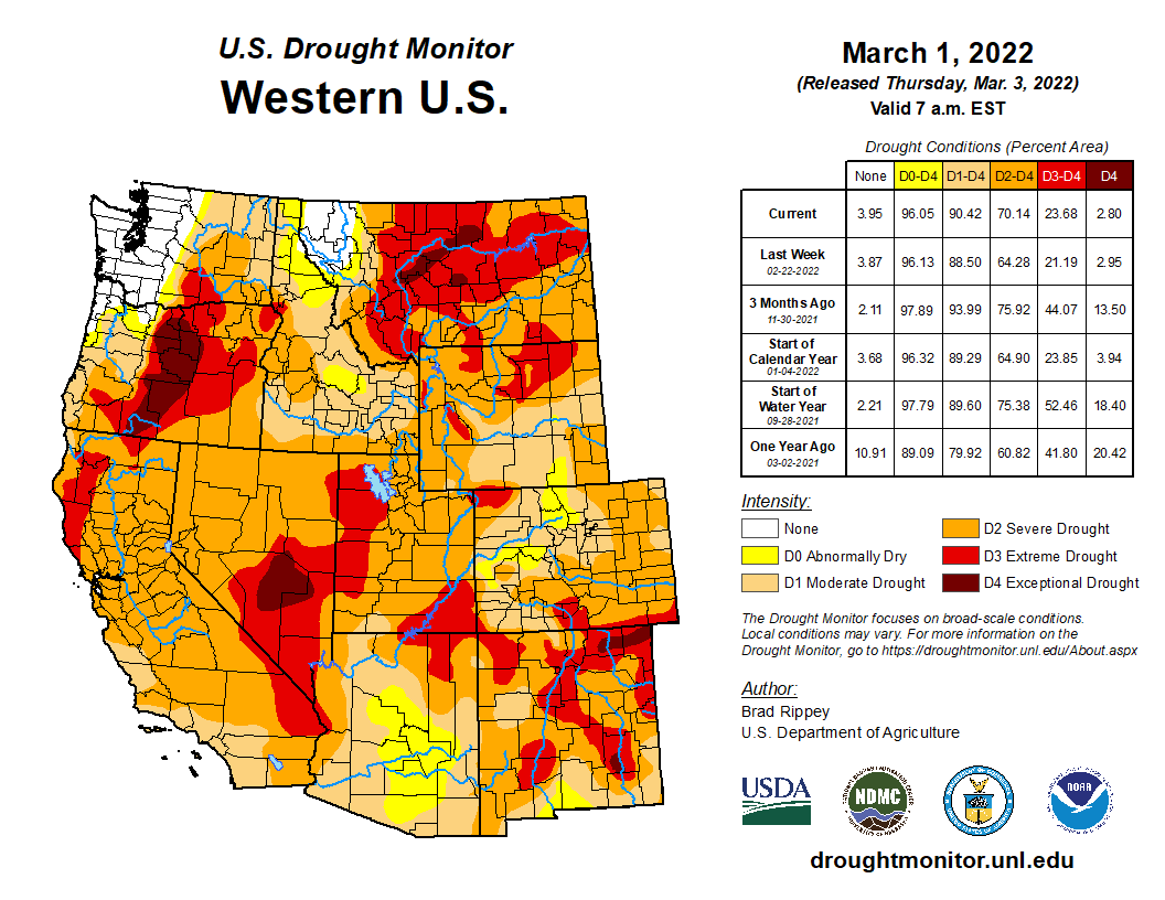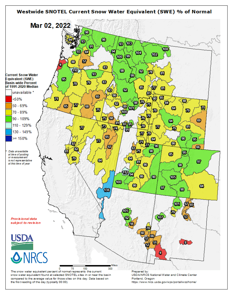 Westwide SNOTEL basin-filled map March 2, 2022 via the NRCS.