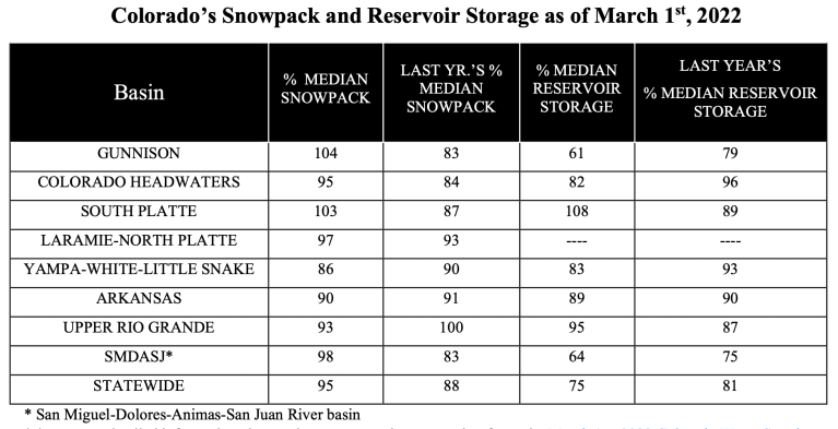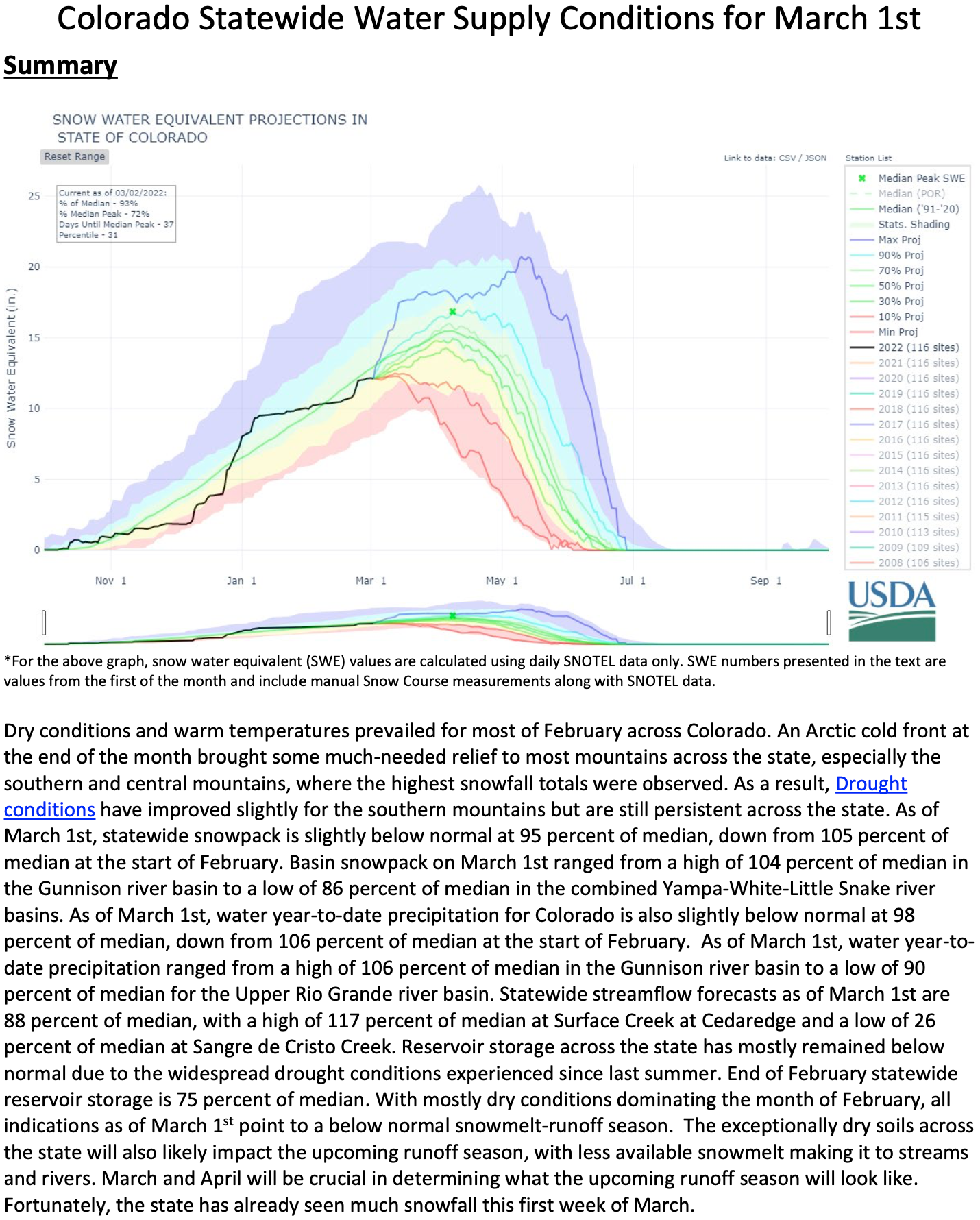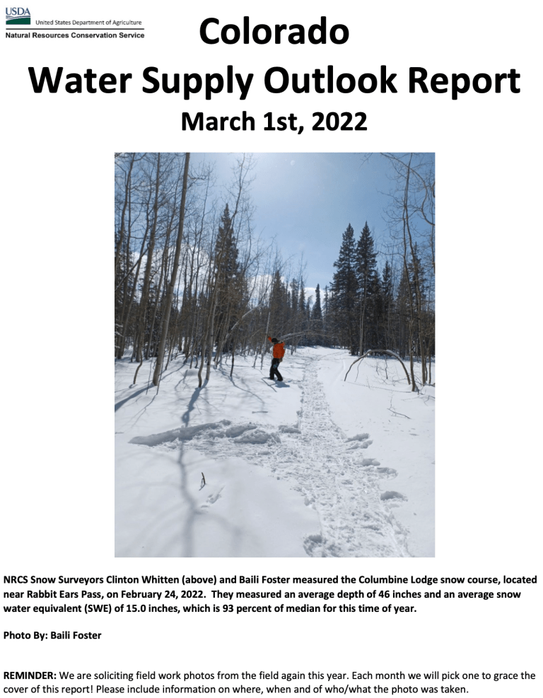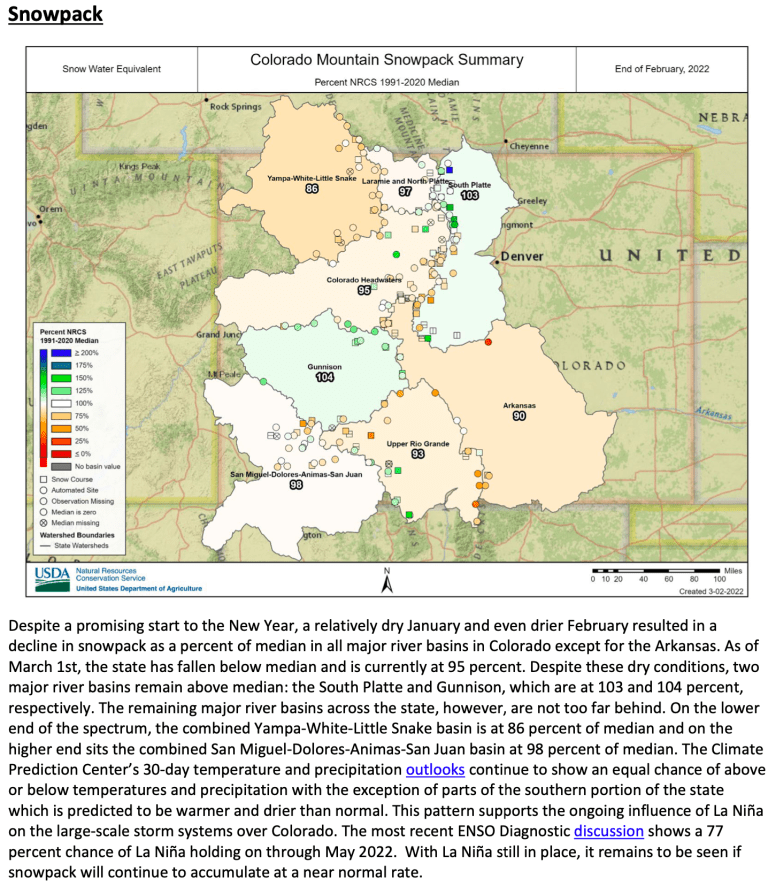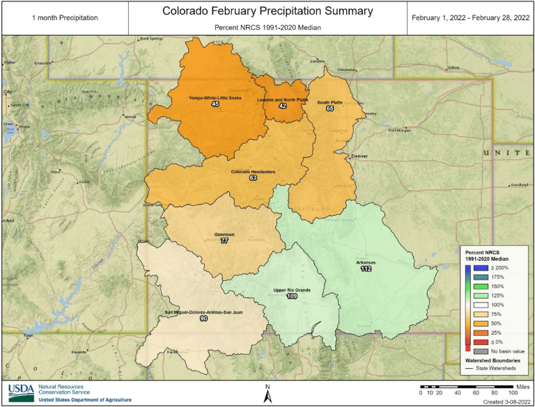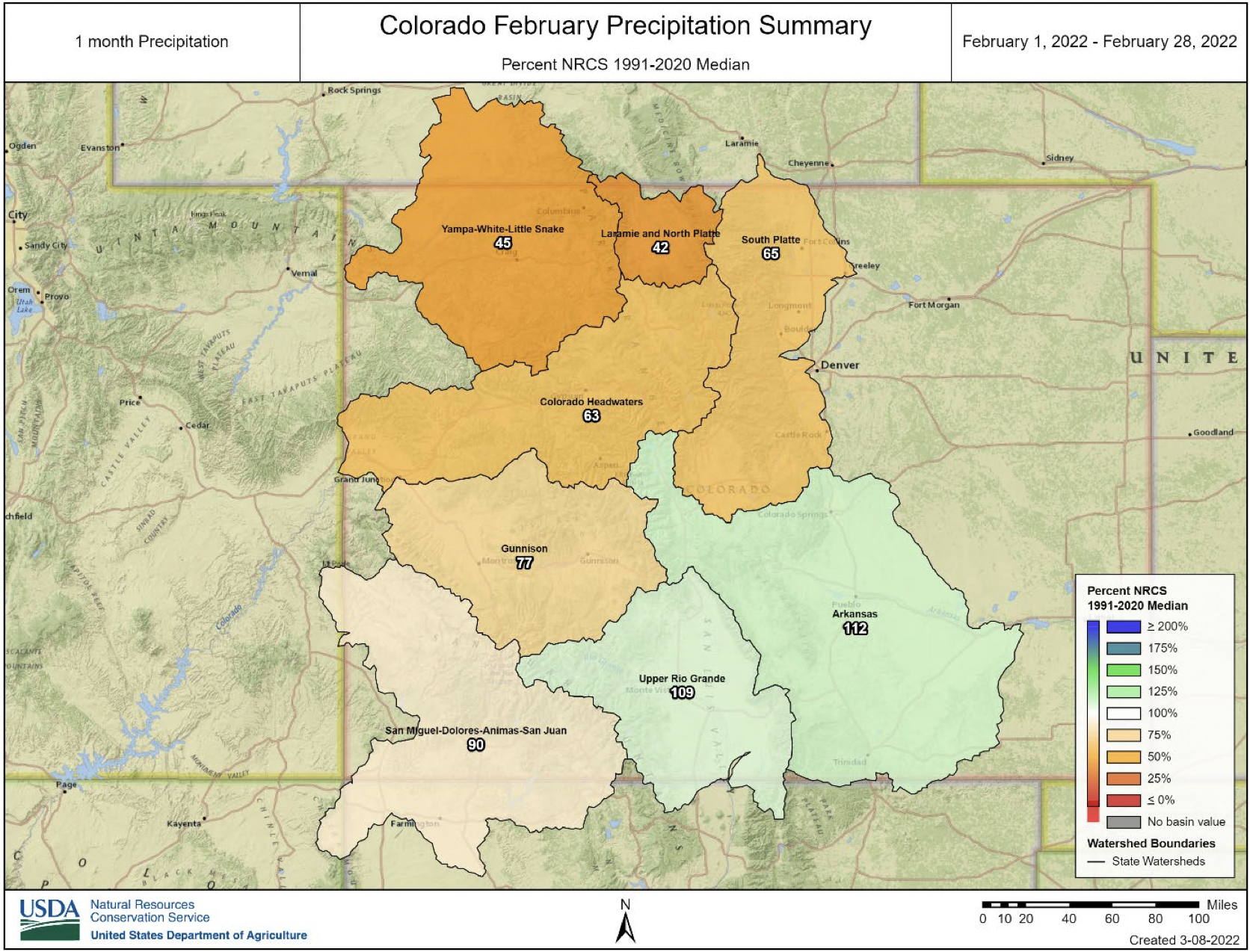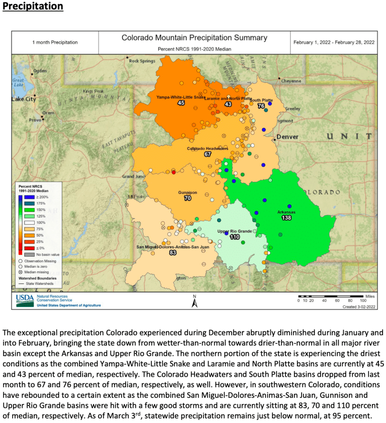 “While the snowpack remains near normal, it’s important to consider the antecedent conditions heading into this winter”, remarks Cole Greensmith, Hydrologist for the Colorado Snow Survey. Greensmith explains, “Several years of low summer precipitation, high summer temperatures combined with dry soils, suggest lower streamflow forecasts despite snowpack levels.” Current statewide streamflow projections are 88 percent of normal. The decline in streamflow forecast volumes is representative of lower precipitation levels in January and February combined with the long-term drought conditions. Historically, March is the snowiest month for Colorado, which we need to bolster the snowpack. If precipitation amounts do not increase in March through the rest of winter, we could be facing a truncated and below average streamflow runoff season this spring and summer.