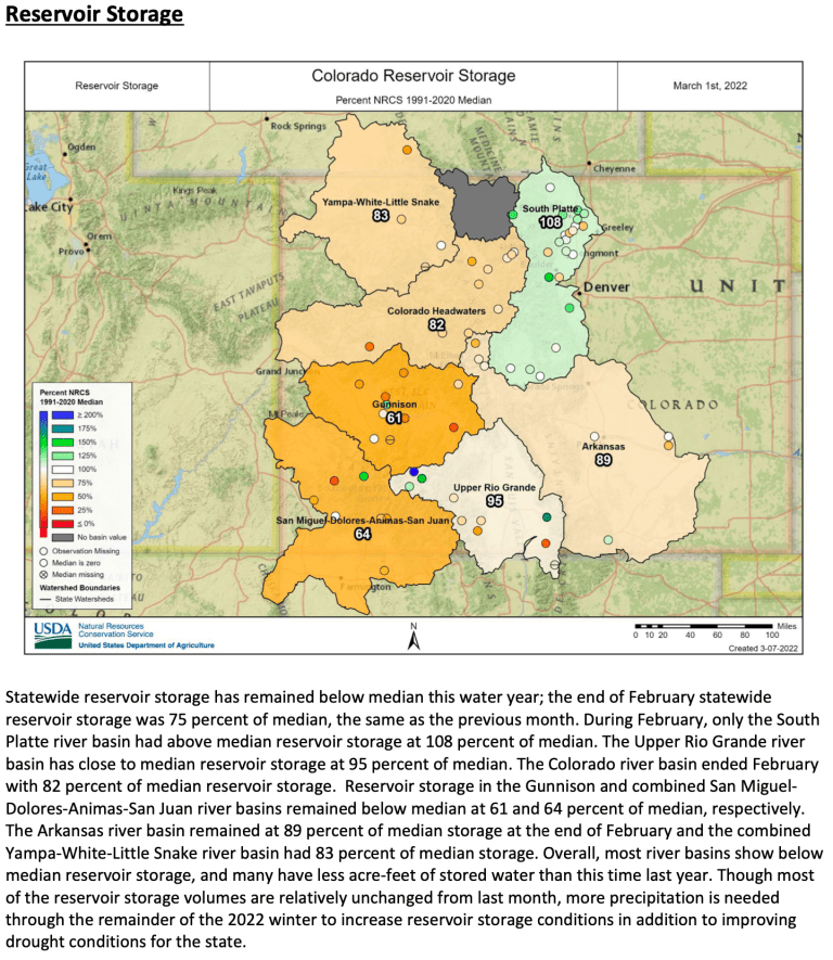 Statewide reservoir storage is 75 percent of median. Currently, southwest Colorado has the lowest reservoir storage in the state with 61 percent of normal in the Gunnison and 64 percent in the combined San Miguel-Dolores-Animas-San Juan river basins. The highest reservoir storage is in the South Platte at 108 percent of normal. While not in the state of Colorado, it is worth noting the existing historic low conditions of Lake Meade and Powell which inevitably affect water resources and decisions for much of the Colorado river basin.