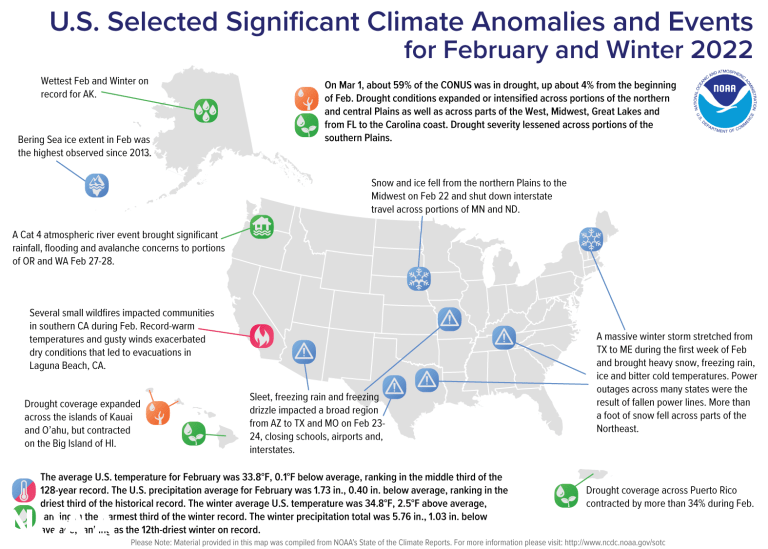 A map of the United States plotted with significant climate events that occurred during February 2022.