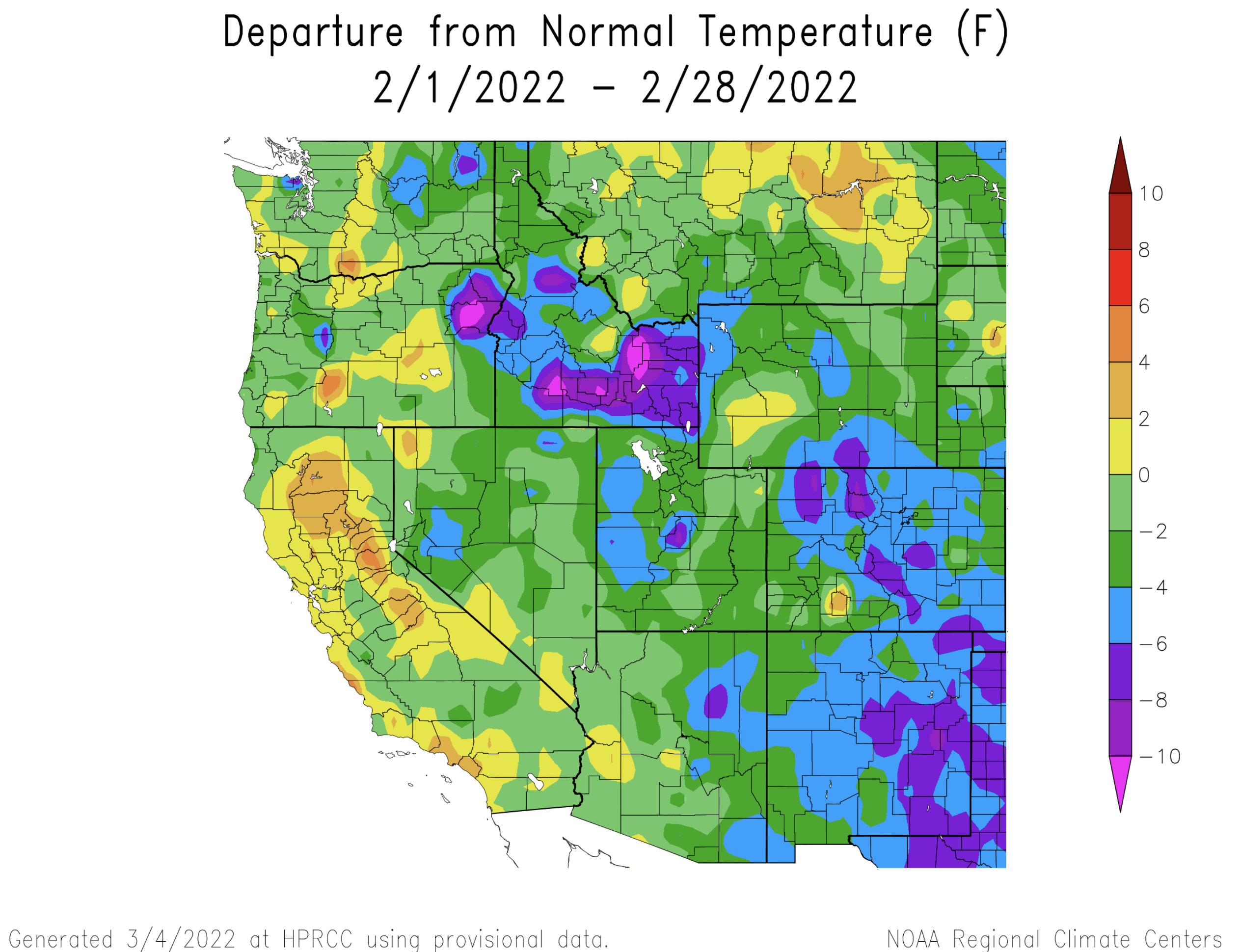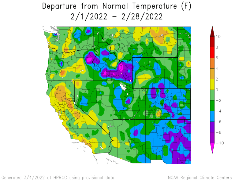 Temperatures were below average during February in Colorado, Utah and Wyoming. In most of Utah and Wyoming, February temperatures were 2-4 degrees below normal and central to eastern Colorado saw temperatures that were 4-8 degrees below normal.