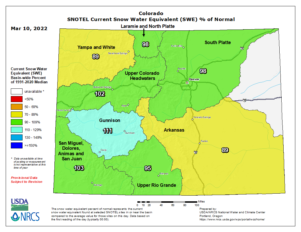 Colorado snowpack basin-filled map March 10, 2022 via the NRCS.