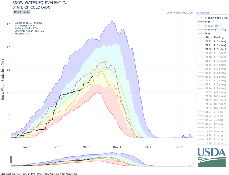 Statewide reservoir storage has remained below average this water year. The Arkansas Basin stands at 89 percent of median storage as of March 1. The NRSC states more precipitation is needed through the remainder of winter to increase reservoir storage in addition to improving drought conditions in the state…