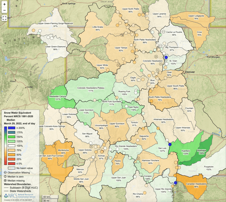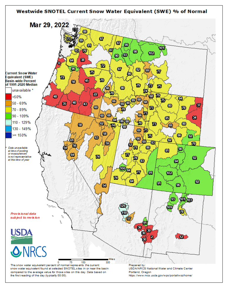 Westwide SNOTEL basin-filled map March 29, 2022 via the NRCS.