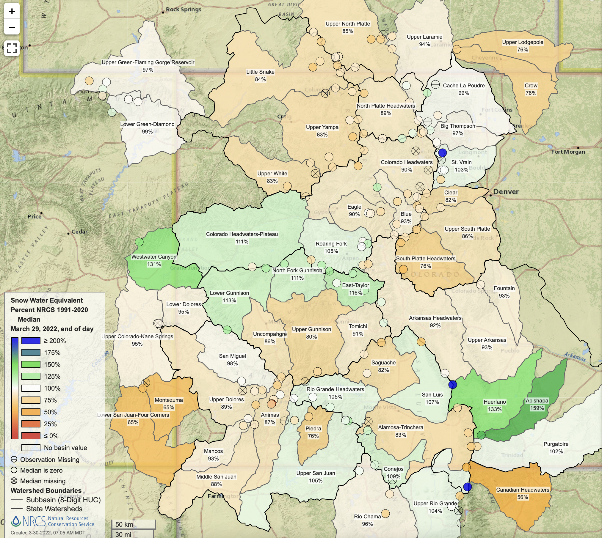 Colorado snowpack sub-basin filled map March 29, 2022 via the NRCS.