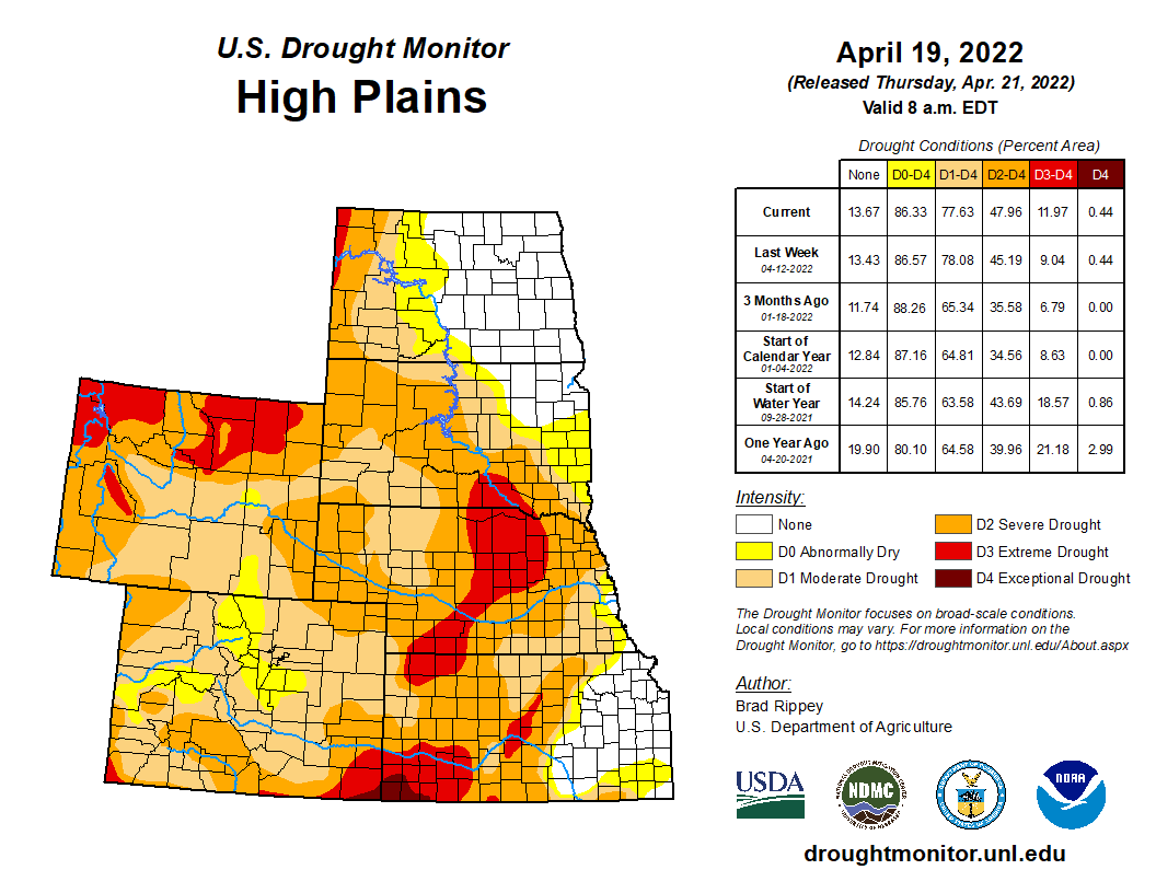 A winter-like storm pounded North Dakota and portions of neighboring states, delivering much-needed moisture but disrupting travel and stressing livestock. Across the remainder of the High Plains, however, windy, dry weather raised dust, resulted in fast-spreading wildfires, and led to a broad increase in the coverage of abnormal dryness (D0) and moderate to extreme drought (D1 to D3). In North Dakota, April 12-14 snowfall included 12.6 inches in Grand Forks (National Weather Service office) and 18.3 inches in Bismarck. Storm-total snowfall topped 2 feet in several North Dakota communities, including Velva (28.0 inches), Lansford (27.5 inches), Dunn Center (26.0 inches), and Underwood (24.3 inches). During the storm, a wind gust to 54 mph was clocked in Bismarck; elsewhere in North Dakota, gusts reached 60 mph in Dickinson and 63 mph in Minot and Hettinger. In the storm’s wake, single-digit low temperatures were common across snow-covered North Dakota, where temperatures fell to 8°F in Minot and Grand Forks. With a low of 0°F on the 16th, Bismarck, North Dakota, experienced its latest-ever reading of 0°F or below—and its coldest April weather since 1996, when it was -1°F on April 5. Temperatures briefly plunged across the central Plains, threatening the already drought-stressed winter wheat crop. Denver, Colorado, registered 10°F on April 13, a record for the date, followed the next day by daily-record lows of 4°F in Sidney, Nebraska, and 9°F in Colby, Kansas. By April 17, the U.S. Department of Agriculture reported that topsoil moisture was rated more than 60% very short to short in each of the region’s states except North Dakota, led by Nebraska (84% very short to short). On the same date, nearly half (48%) of the winter wheat in Colorado was rated in very poor to poor condition. One-fifth to one-third of the wheat was rated very poor to poor in Kansas (31%), Nebraska (27%), and South Dakota (22%)…