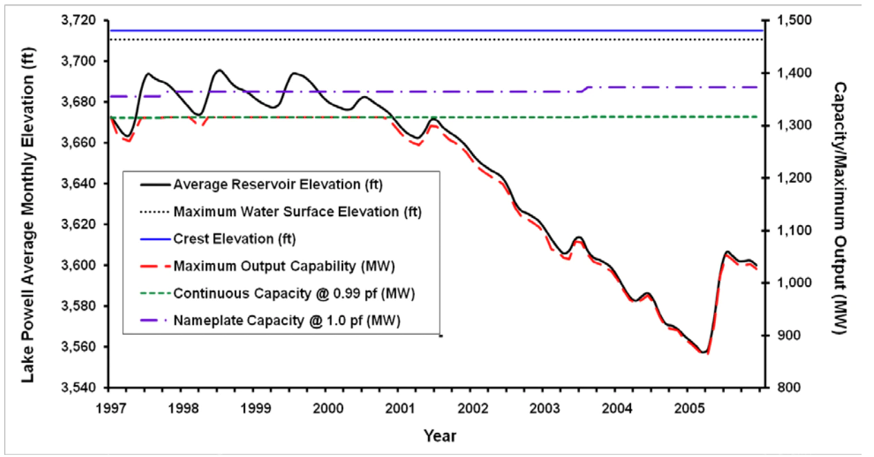 Due to changing Lake Mead elevations, Hoover’s generator capacity is adjusted based on estimated effective capacity and plant availability. The estimated effective capacity is based on projected Lake Mead elevations. Unit capacity tests will be performed as the lake elevation changes. This study reflects these changes in the projections.