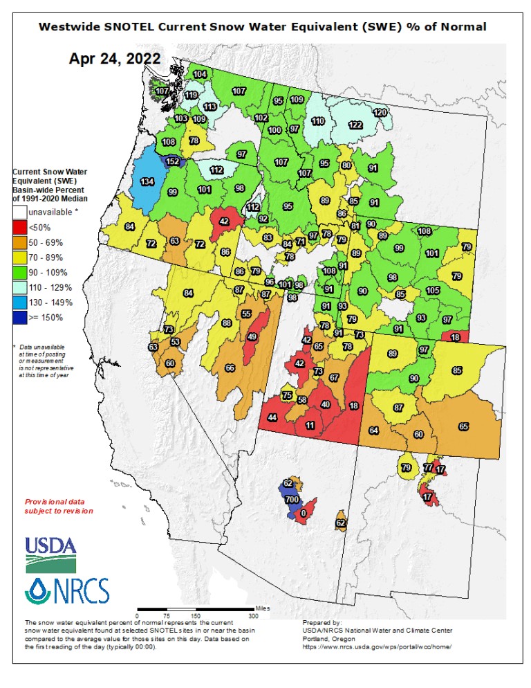 Westwide SNOTEL basin-filled map April 27, 2022 via the NRCS.