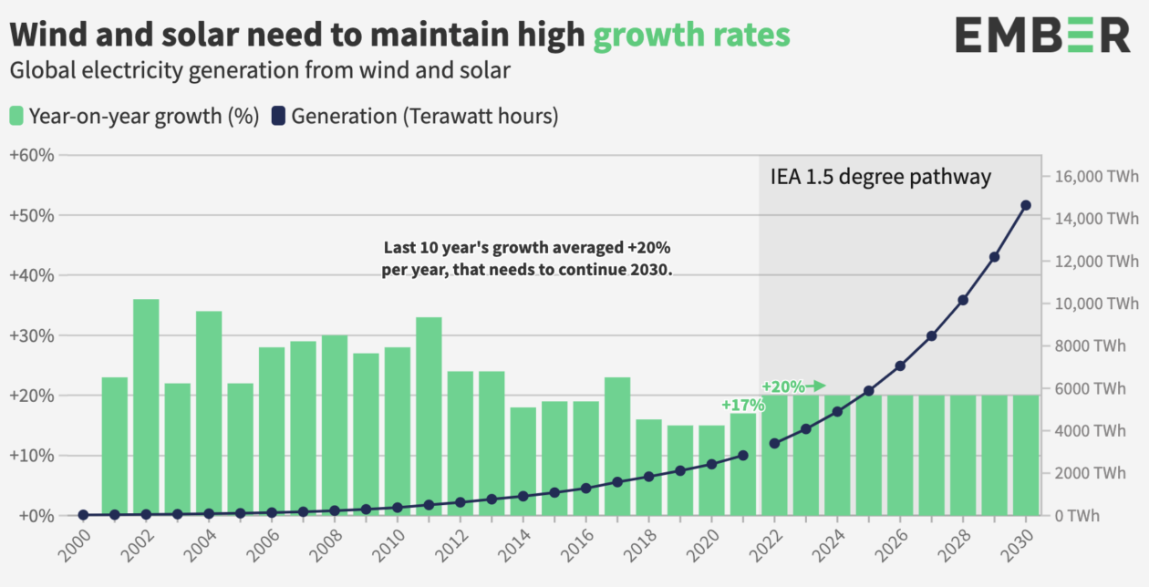 The pace of renewable energy growth needed to stay on track for 1.5 degrees C of warming. EMBER