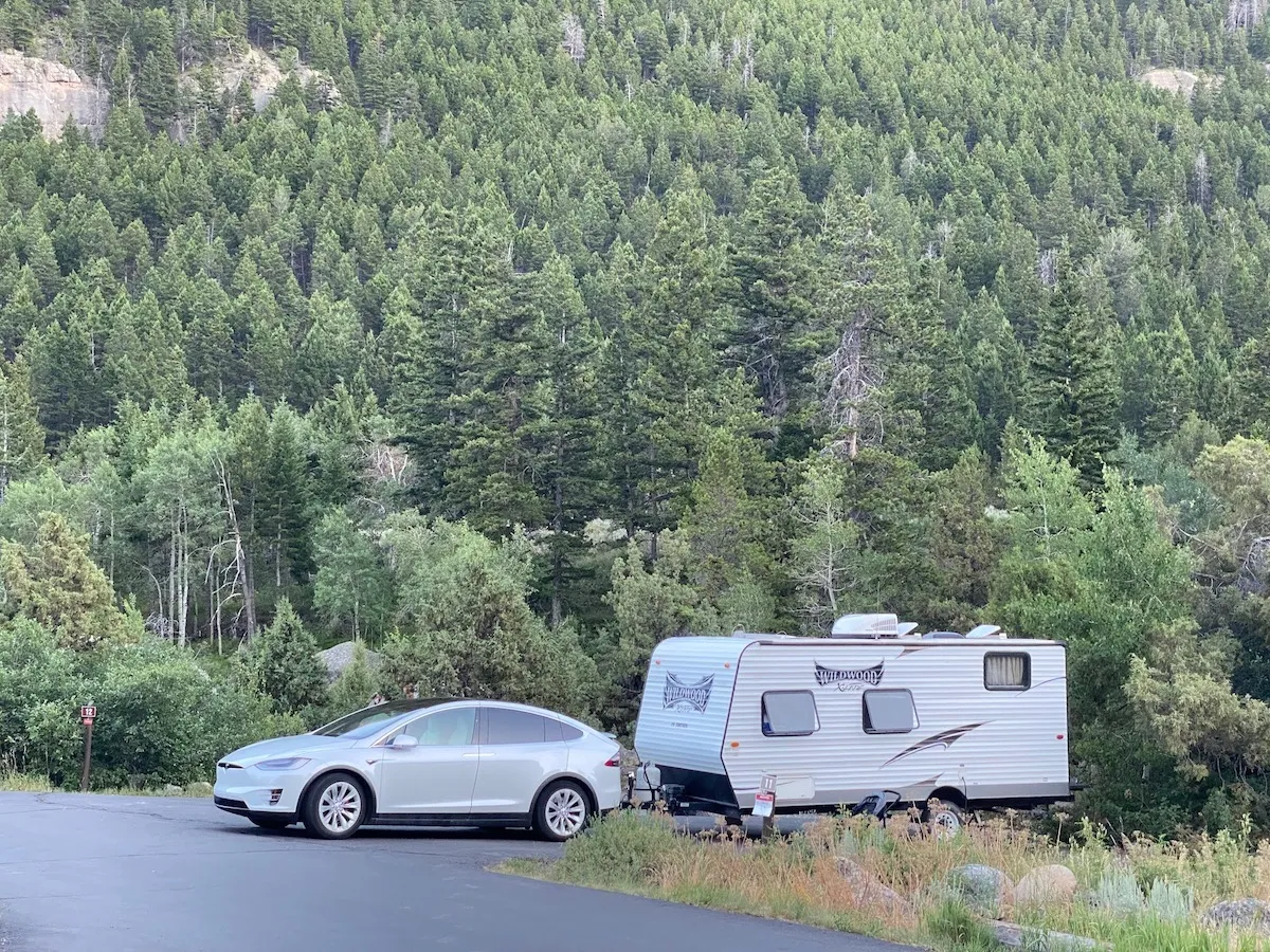 A Tesla Model X 100D hitched to a camper in Sinks Canyon outside of Lander. (Patrick Lawson)