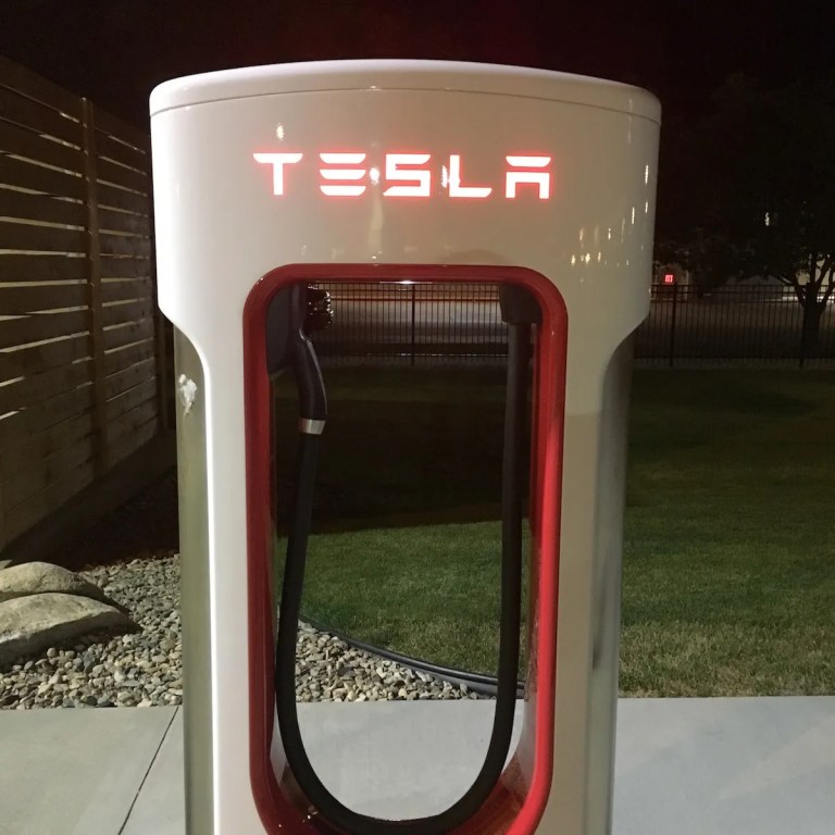 Tesla installed a series of electric charging stations in Wyoming, including this one in Sheridan. But the stations only work for Tesla vehicles. (Dustin Bleizeffer/WyoFile)
