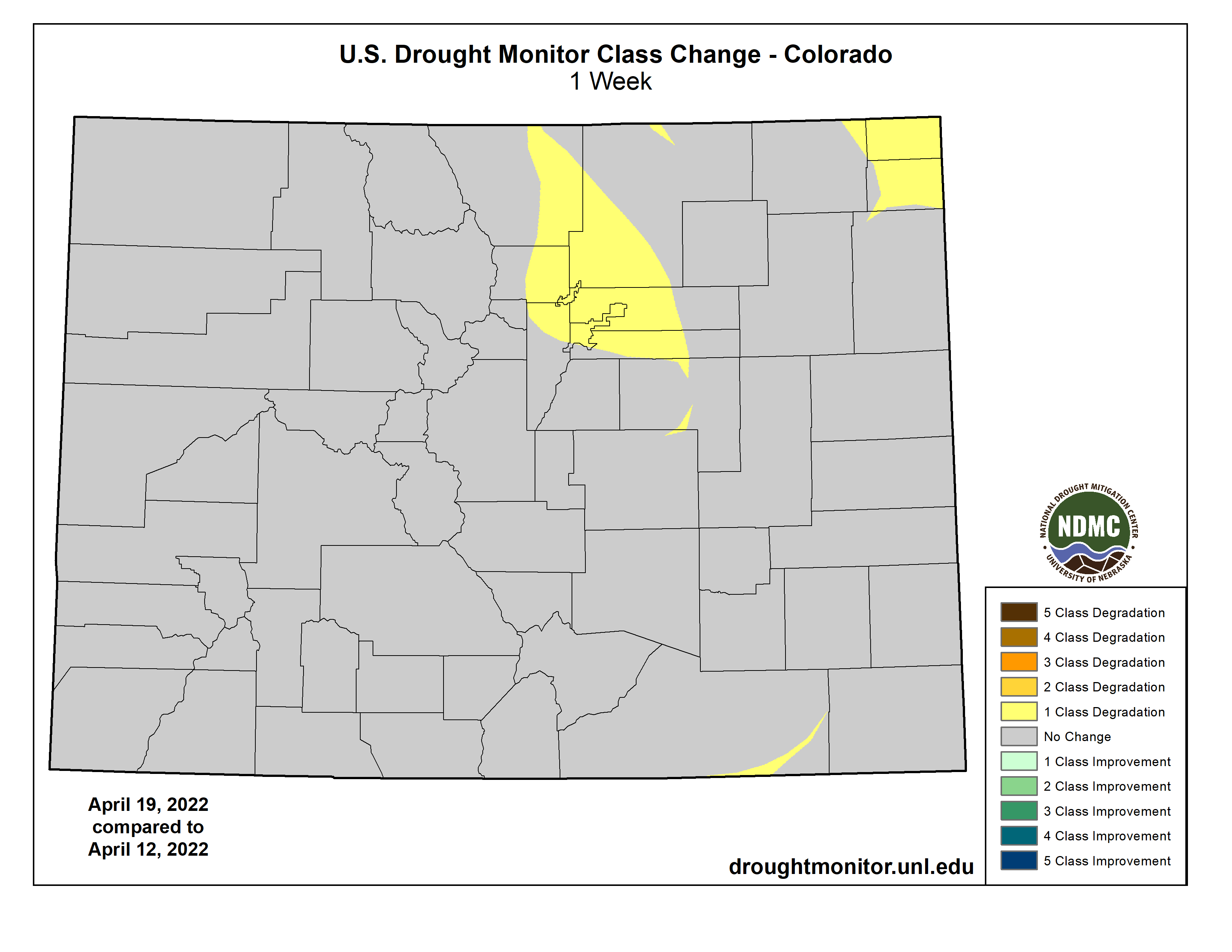 Colorado Drought Monitor one week change map ending April 19, 2022.