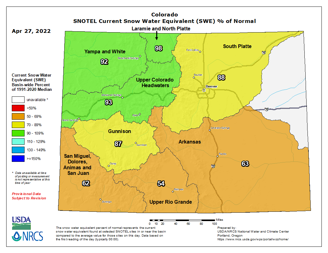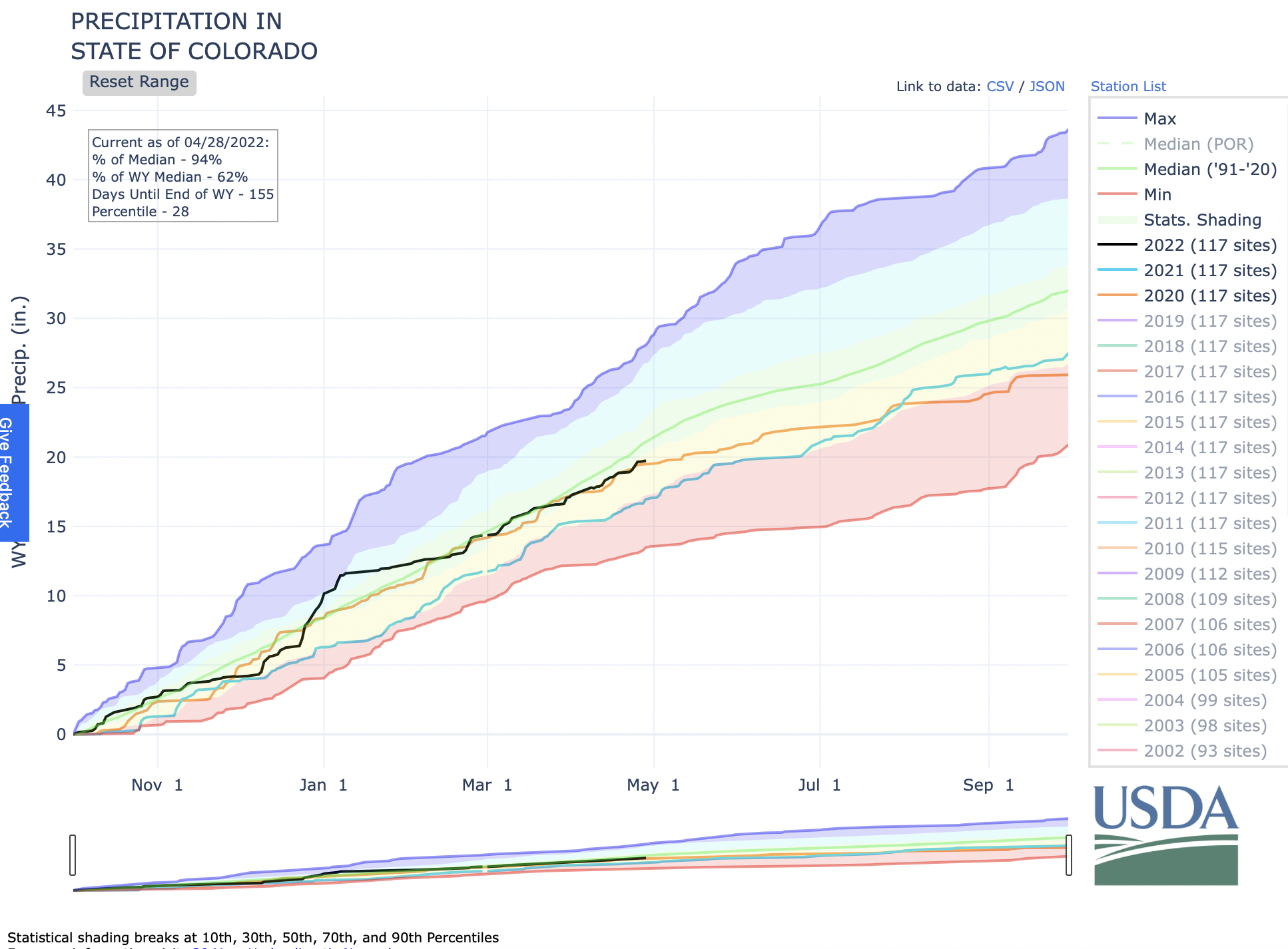 State of Colorado water year precipitation April 28, 2022 via the NRCS.