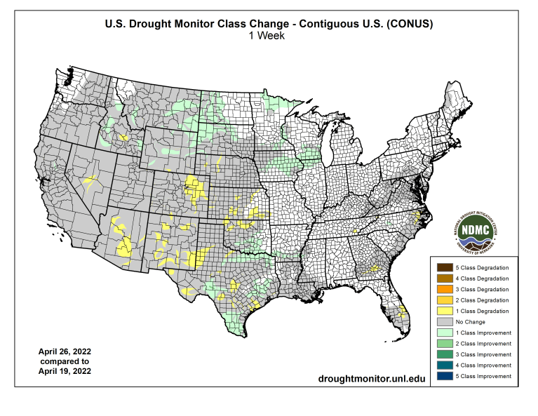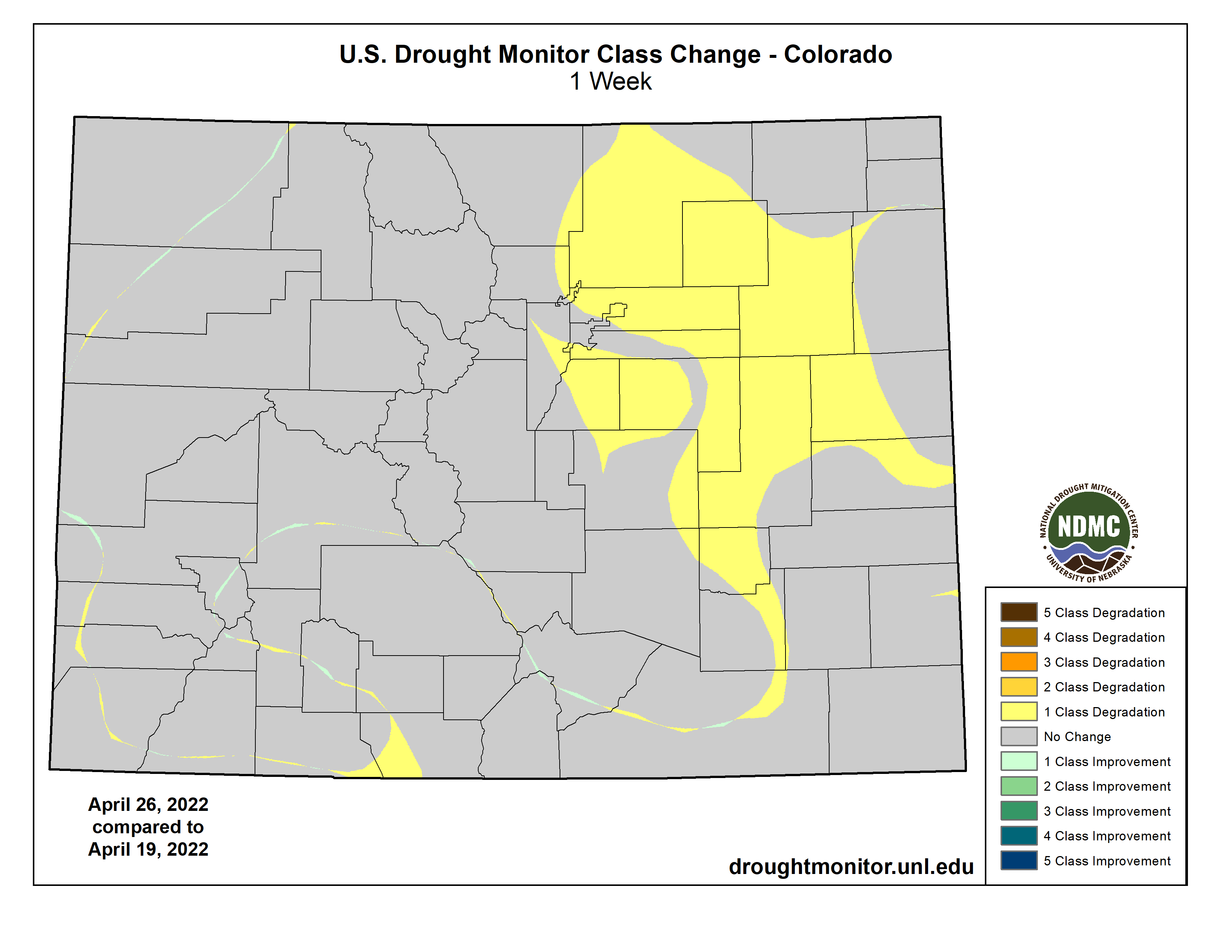 Colorado Drought Monitor one week change map ending April 26, 2022.