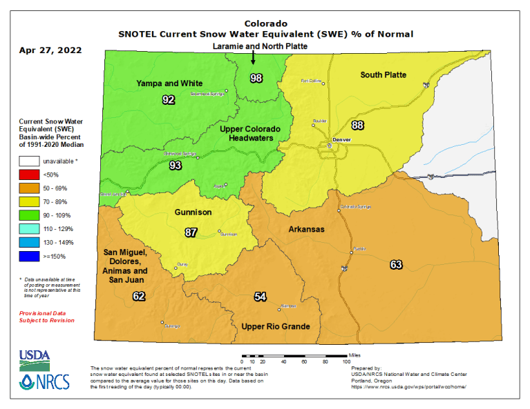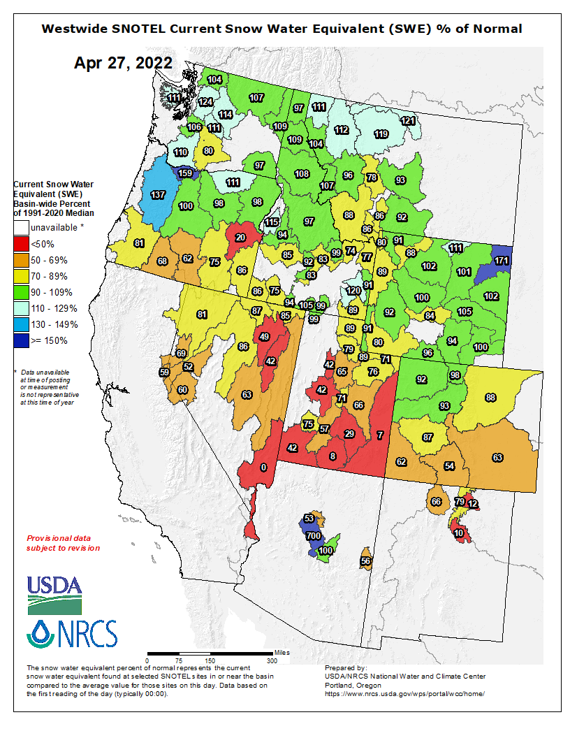 Westwide SNOTEL basin-filled map April 27, 2022 via the NRCS.