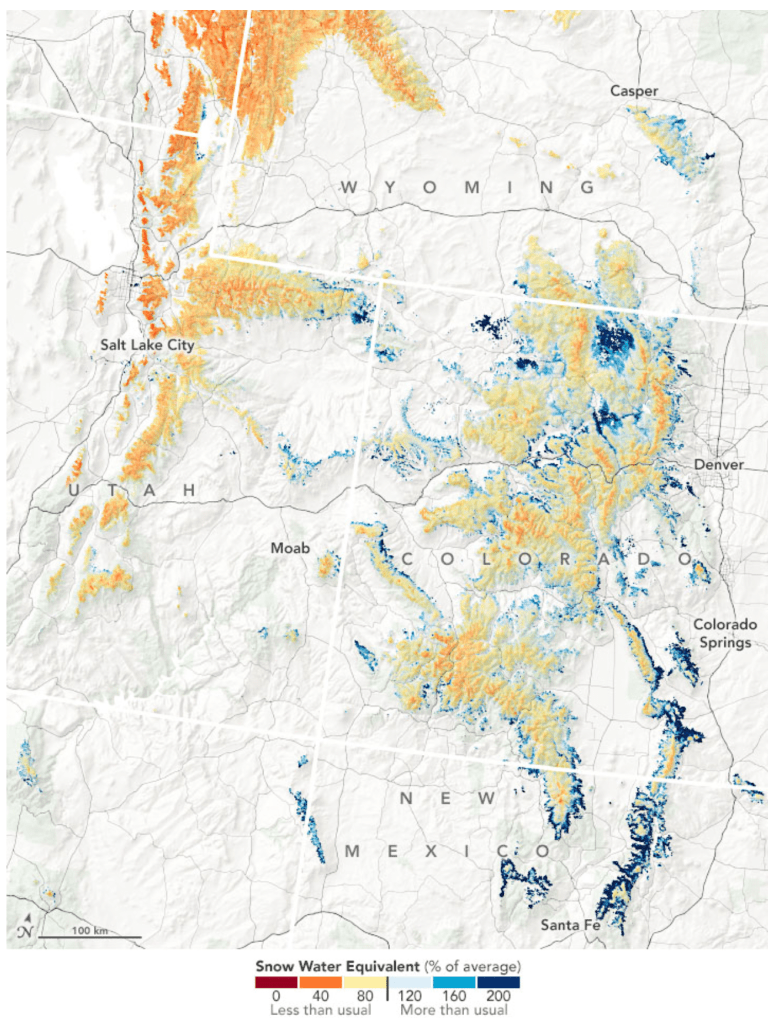 Despite some pockets of anomalously high SWE, most areas range from 46 to 95 percent of the 2000–2020 average. Data on the snow-covered area come from Moderate Resolution Imaging Spectroradiometer (MODIS) on NASA’s Terra satellite. The model also accounts for variables such as elevation, slope, latitude, and upwind mountain barriers, as well as historical patterns of SWE and melting dates.