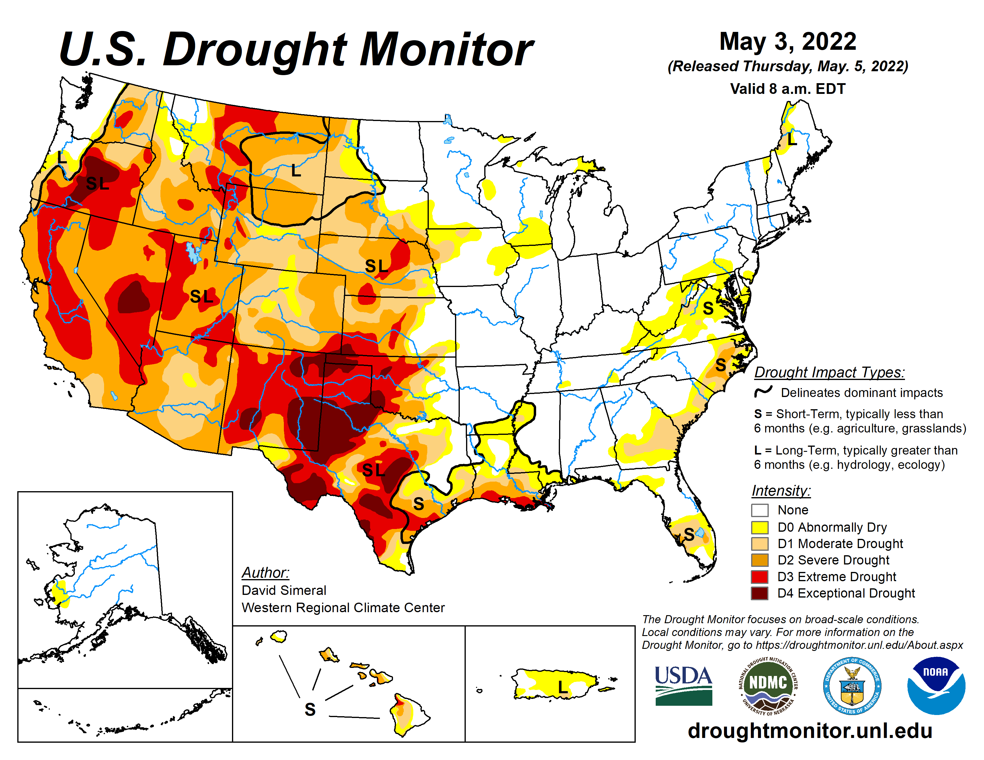 According to the May 3 U.S. Drought Monitor report, 53.8 percent of the contiguous U.S. was in drought, down about 4 percentage points from the end of March. Drought conditions expanded or intensified across portions of the West, central Plains and Deep South. Drought contracted or was eliminated across portions of the lower Mississippi Valley, the Great Lakes, the Northern Rockies and Plains, and Pacific Northwest, and across portions of Hawaii.