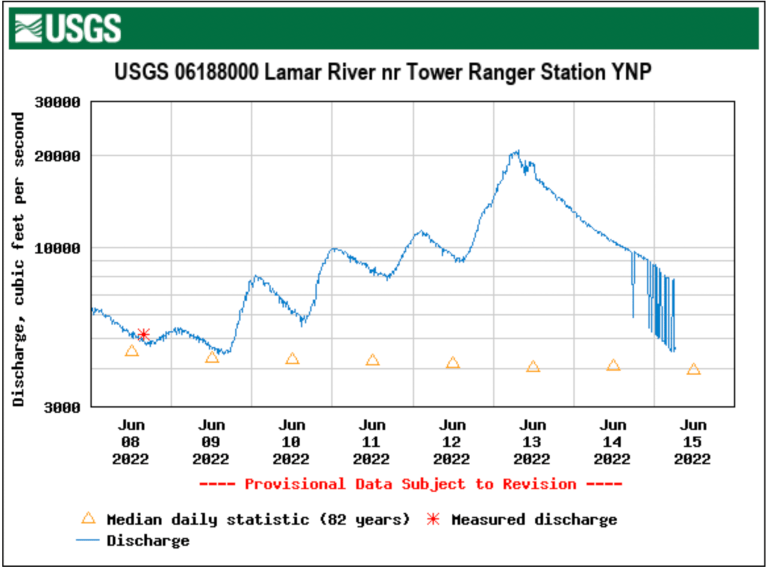 A U.S. Geological Survey gauge on the Lamar River near the Tower Ranger Station tells the tale of the remarkable weather event. The tributary to the Yellowstone River on Monday topped 18,000 cubic feet of water per second, which surpassed the previous daily record by nearly 50%. The Lamar rose so high that its peak water level, 17 feet over the riverbed, surpassed the gauge’s “operational limit” by 2 feet, and the water level was 5 feet higher than during any other time in 82 years of record keeping.