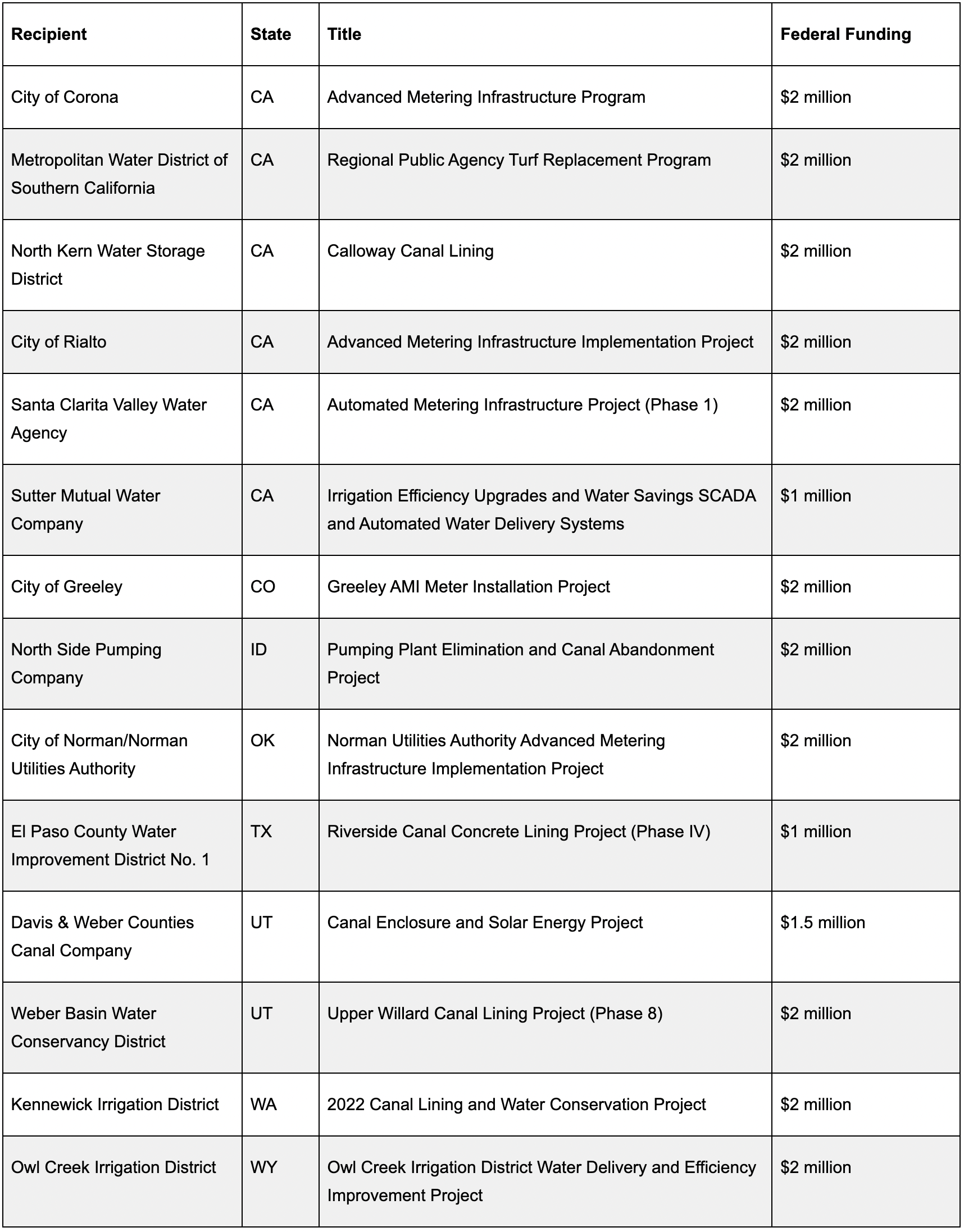 Fourteen projects in eight western states will be awarded funding to help local communities improve water use efficiency by lining canals, upgrading water meters, installing automated gates to control water flow and making other infrastructure improvements. The projects are anticipated to save more than 12 billion gallons of water annually – enough to fill over roughly 880,000 swimming pools–through reductions in residential water use and improvements to increase irrigation efficiency. Two of the projects will also receive funding for solar energy installations to power the affiliated water facility and water district buildings. Including non-federal funding contributions, the projects represent more than $130 million in water management improvements.