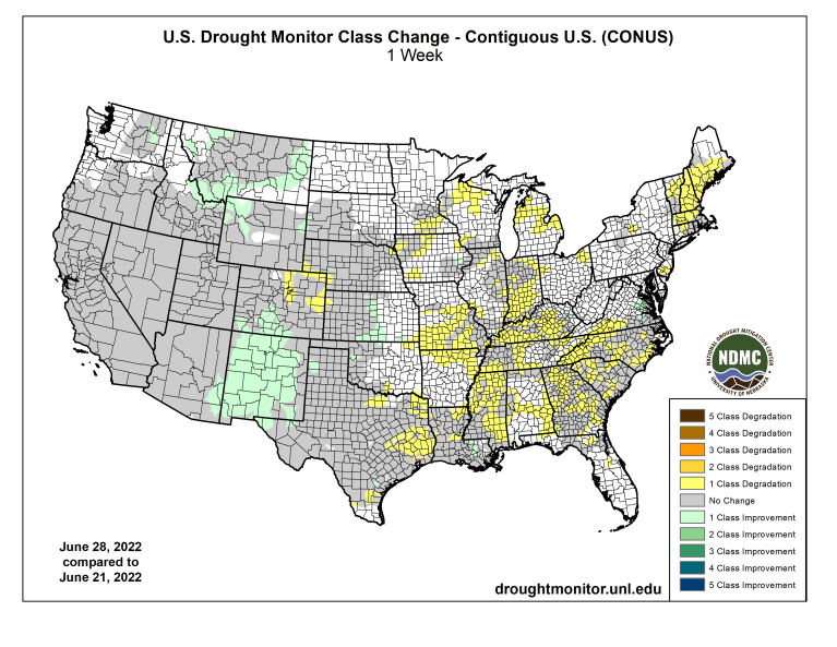US Drought Monitor one week change map ending June 28, 2022.