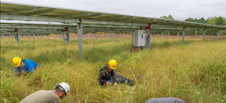 On a humid, overcast day in central Minnesota, a dozen researchers crouch in the grass between rows of photovoltaic (PV) solar panels. Only their bright yellow hard hats are clearly visible above the tall, nearly overgrown prairie grasses—which are growing exactly as expected.