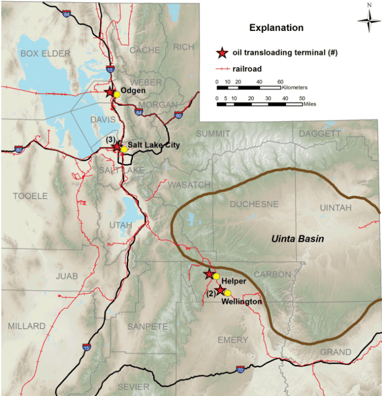 The Uinta Basin is shown on this map, along with existing rail terminals in Carbon County, Utah, where limited amounts of the basin’s waxy crude is loaded into train cars. A proposal to create a direct rail link to the basin would provide shippers with enough transportation capacity to quadruple output.