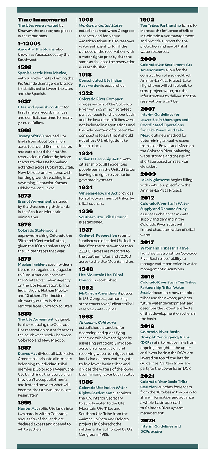 As the settlement stipulates, the moment the tribes begin to use water from Lake Nighthorse, they will each inherit an annual bill of around $800,000 in operations and maintenance costs for the dam and pumping facilities that the federal government is currently footing. At the moment, there is still no infrastructure to deliver the water to the tribes, and the tribes are not prepared to take on those costs, so they haven’t used any of their water. This may change due to the $2.5 billion earmarked in the 2021 Infrastructure Investment and Jobs Act for completion of authorized Indian water rights settlements. Both Colorado Ute tribes are pursuing that funding, with full support from the State of Colorado, according to the Colorado Water Conservation Board (CWCB), but whether they will receive it remains to be seen. Information sessions on the bill between tribal nations and DOI are ongoing.