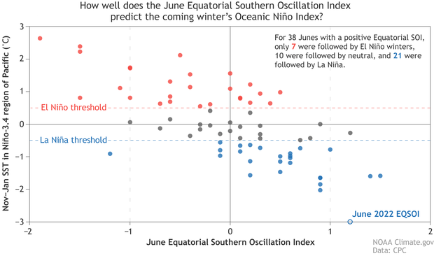 Each dot on this scatterplot shows the atmospheric ENSO conditions each June (horizontal axis) since 1950 versus the oceanic ENSO conditions the following NovemberāJanuary (vertical axis). When the June Equatorial Southern Oscillation Index (ESOI) is negative, winter Oceanic NiƱo Index conditions are frequently in the El NiƱo range (red dots), sometimes neutral (gray dots), but rarely in the La NiƱa range (blue dots). When June ESOI is positive, the winter is usually in the La NiƱa range, sometimes in the neutral range, but rarely in the El NiƱo range. The June 2022 EQSOIāshown as an open circle on the horizontal axisāwas the third-highest June SOI on record. Data from CPC, image by Climate.gov.