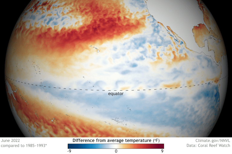 Sea surface temperatures around the equator in the central and eastern Pacific were mostly cooler than average (blue) in June 2022. A few warm pockets (orange) dotted the far eastern Pacific. NOAA Climate.gov map from our Data Snapshots collection.