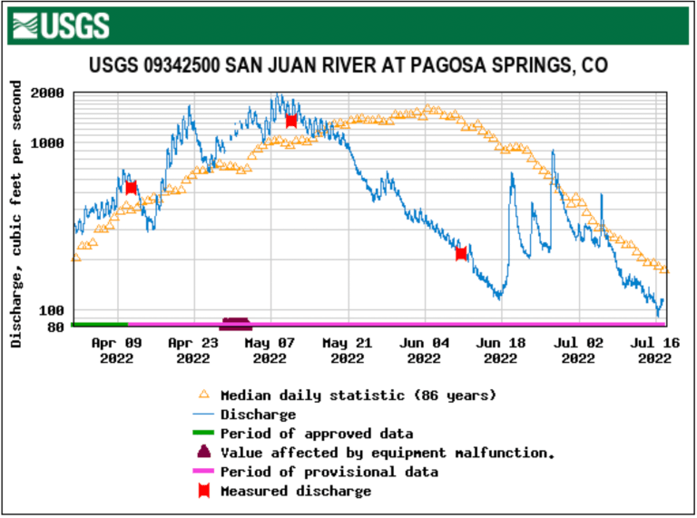Stream flow for the San Juan River on July 13 at approximately 9 a.m. was 132 cubic feet per second (cfs), according to the U.S. Geological Service (USGS) National Water Dashboard. This is down from a nighttime peak of 150 cfs at 4 a.m. on July 13. Flows are down from last week’s reading of 328 cfs at 9 a.m. on July 6 and from that day’s nighttime peak of 499 cfs at 2:45 a.m. The median flow for July 13 for the period between 1987 and 2022 is 205 cfs. Last year, the San Juan River was at 86.1 cfs at 9 a.m. on July 13, down from a nighttime peak of 102 cfs at 9:15 p.m. on July 12.