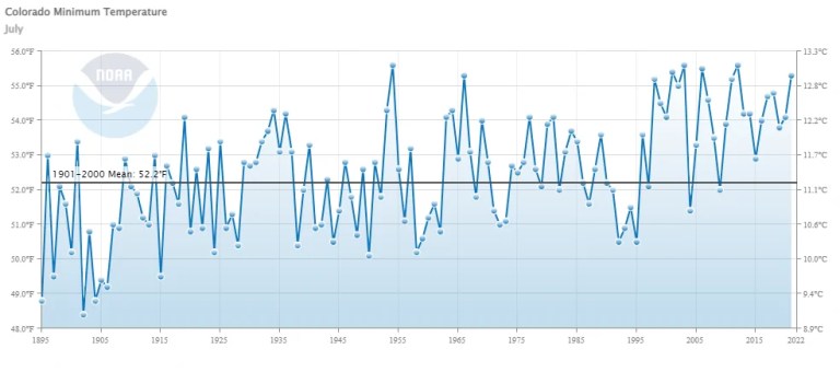 “In general, we know that summer minimum temperatures are rising,” said Peter Goble, a climatologist with the Colorado Climate Center. This summer’s overnight lows so far in 2022 haven’t been setting new high marks – but they’re very, very close.