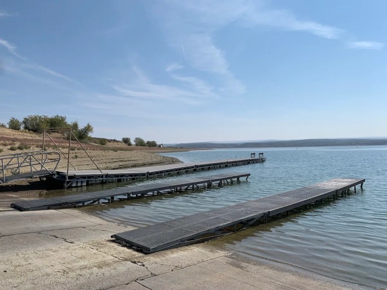 Boat ramps stretch to the water at Flaming Gorge Reservoir in September 2021. (Dustin Bleizeffer/WyoFile)