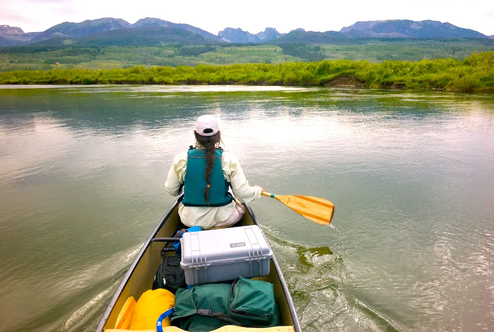 A paddler plies the placid waters of the upper Green River, with the Bridger Wilderness of the Wind River Mountains as a backdrop. The Green River is the main tributary to the troubled Colorado River. (Angus M. Thuermer Jr/WyoFile)