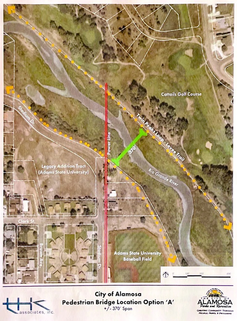 The city of Alamosa is moving forward with plans for a pedestrian bridge crossing at Stadium Drive behind the Adams State ballfields that will connect the west levee to the east levee at Cattails Golf Course.