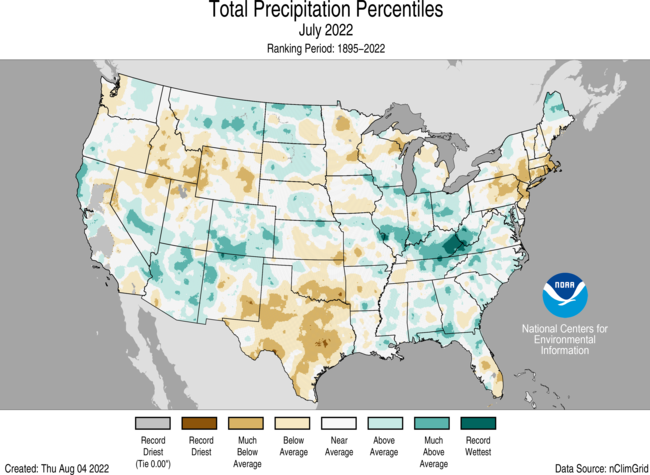 Record rainfall received during the last week of July contributed substantially to the fourth-wettest July on record for Kentucky. Conversely, a lack of precipitation received during the month resulted in Rhode Island ranking second driest while Texas had its fifth-driest July on record.