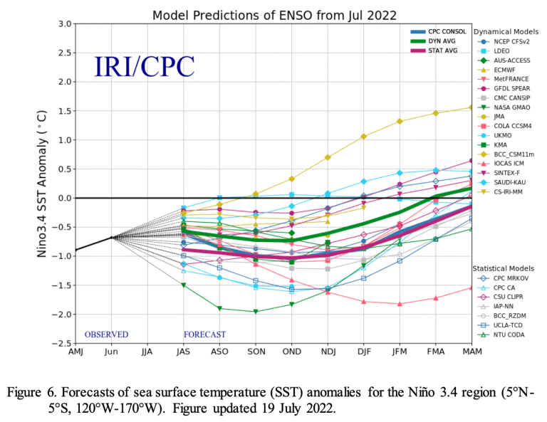 The most recent IRI plume average for the Niño-3.4 SST index forecasts La Niña to persist into the Northern Hemisphere winter 2022-23. The forecaster consensus, supplemented with the latest models from the North American Multi-Model Ensemble (NMME), concurs that La Niña is the most likely outcome during the fall and winter. While a majority of NMME models suggest that La Niña will transition to ENSO-neutral in January-March 2023, forecasters are split on this outcome resulting in equal forecast probabilities for that season. In summary, La Niña is expected to continue, with chances for La Niña gradually decreasing from 86% in the coming season to 60% during December-February 2022-23.
