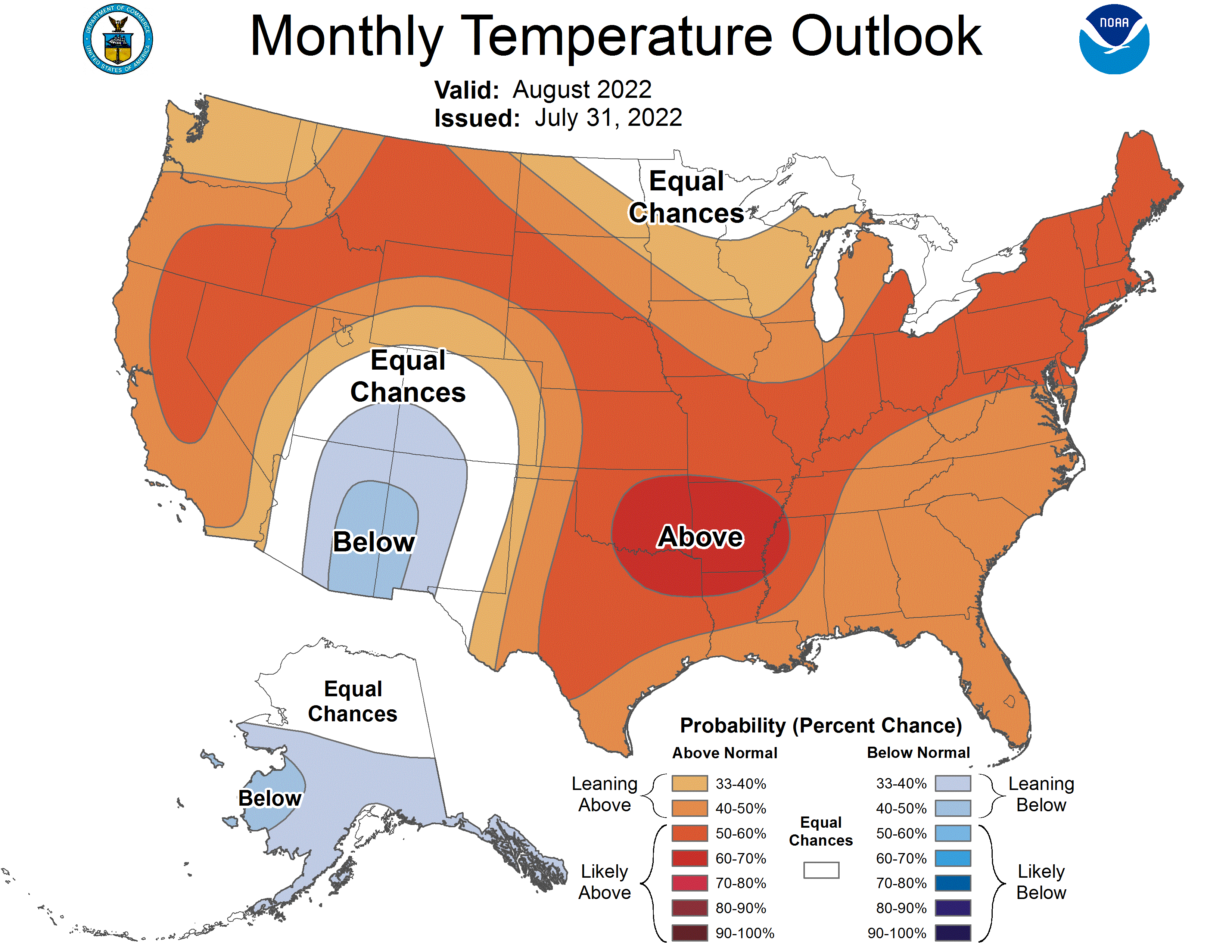 According to the July 31 One-Month Outlook from the Climate Prediction Center, much of the West and from the Plains to the East Coast have the greatest chance of receiving above-normal temperatures in August, whereas the greatest chance for below-normal temperatures is projected to occur across portions of the Southwest and the southern half of Alaska.