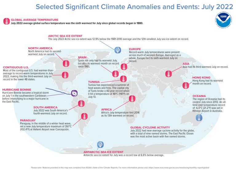 A map of the world plotted with some of the most significant climate events that occurred during July 2022. Please see the story below as well as more details in the report summary from NOAA NCEI at http://bit.ly/Global202207.