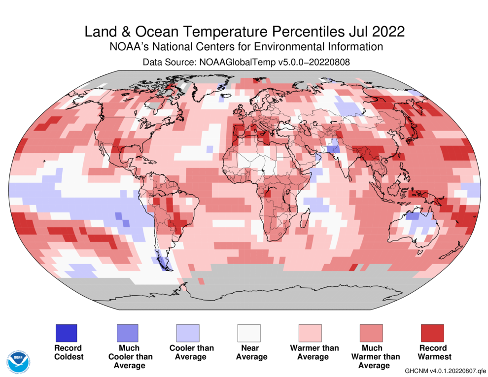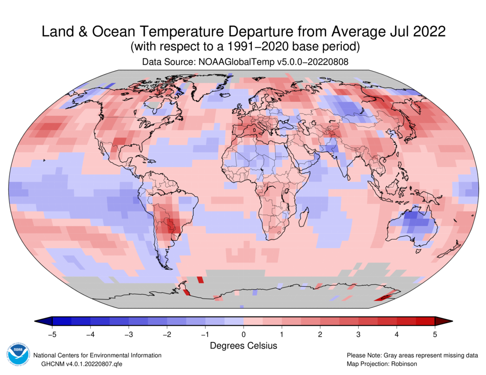 Globally, July 2022 was the sixth-warmest July in the 143-year NOAA record. The year-to-date (January-July) global surface temperature was also the sixth-warmest on record. According to NCEI’s Global Annual Temperature Outlook, there is a greater than 99% chance that 2022 will rank among the 10-warmest years on record but only an 11% chance that it will rank among the top five.