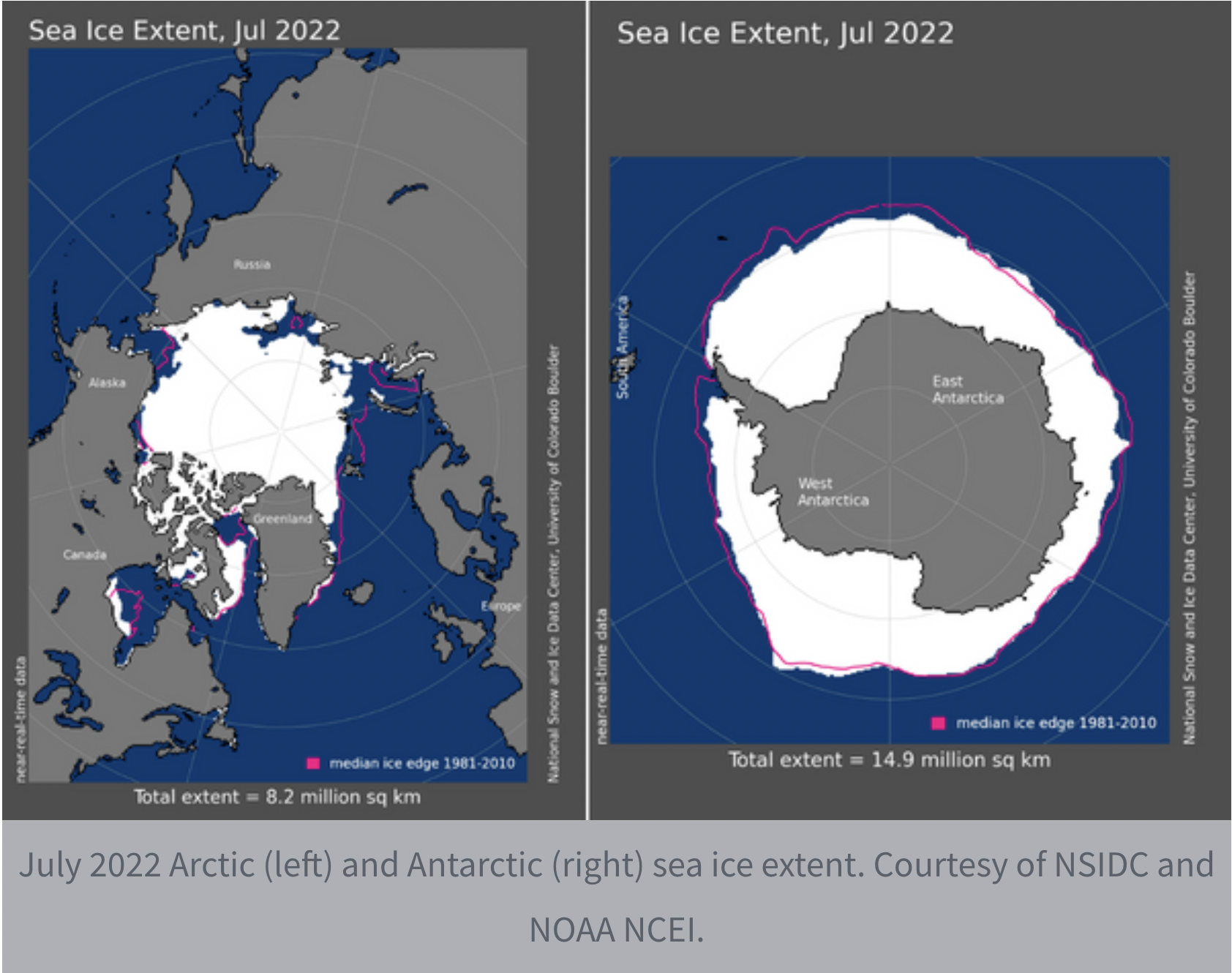 uly 2022 Arctic (left) and Antarctic (right) sea ice extent. Courtesy of NSIDC and NOAA NCEI.