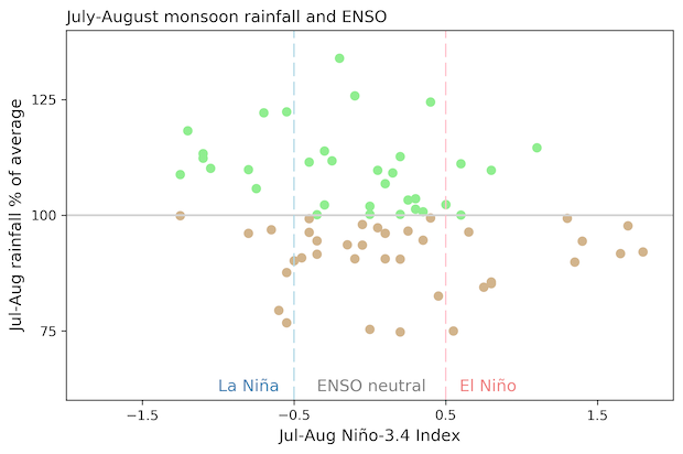 July–August rainfall anomaly averaged over North American Monsoon region for every year 1950–2019 (y-axis) versus Niño-3.4 index (x-axis). Wetter-than-average monsoons (green dots) are slightly more common during La Niña years, while drier-than-average monsoons (brown dots) are slightly more common during El Niño years. Monsoon region averaged over all land gridpoints, 20°N–37°N, 102°W–115°W. Data from Global Precipitation Climatology Centre (GPCC) and ERSSTv5. Figure by Emily Becker.