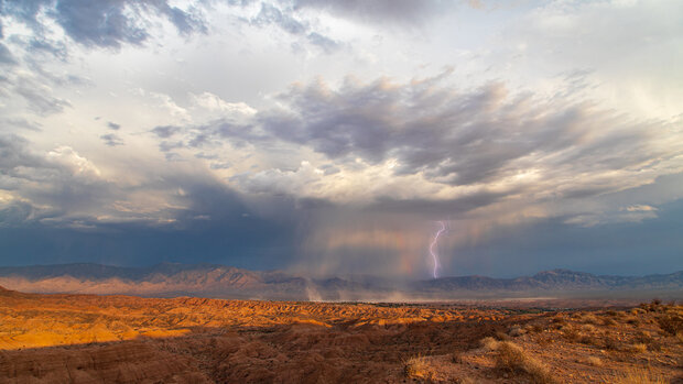 Rain and lightning over desert hills near Mesquite, Nevada, on August 30, 2021, during the summer monsoon. Photo by Flickr user John Getchel. Used under a Creative Commons license.