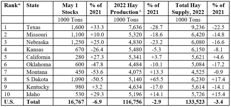 Table 1. May 1 Hay Stocks, Hay Production and Total Hay Supply, Top Ten States and U.S., 2022. Forecast; USDA-NASS, Crop Production, August 2022
