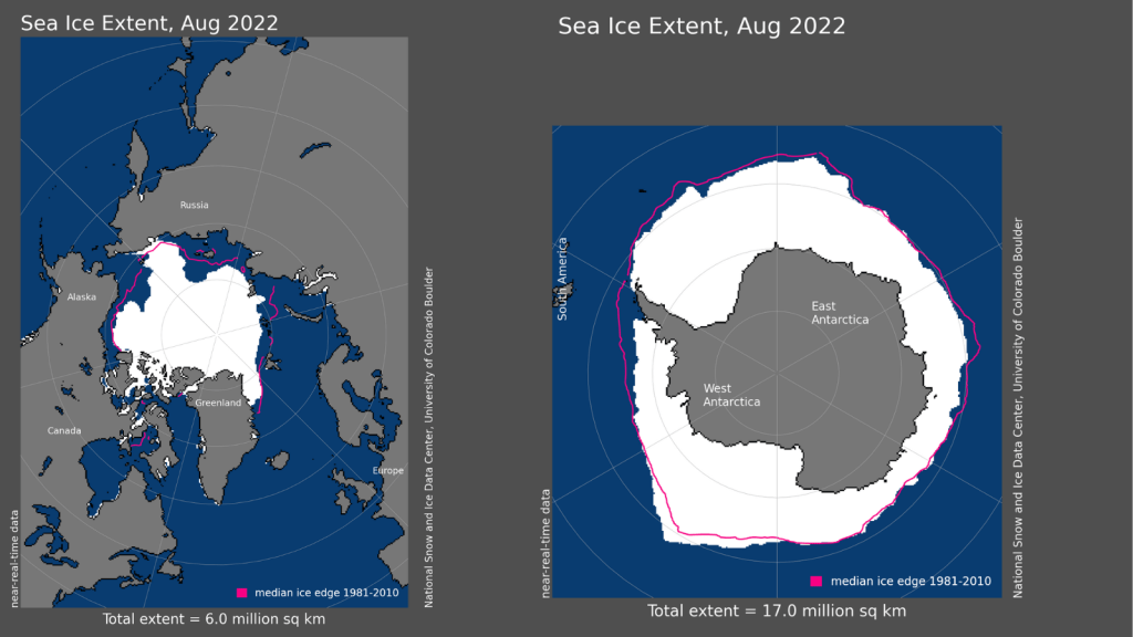 Globally, August 2022 saw the fifth-lowest August sea ice extent on record.