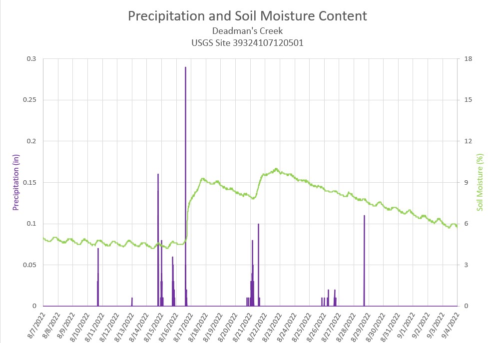 The chart below shows the precipitation and soil moisture from the Deadman’s Creek location. Prior to the rainfall the week of August 14, the soil moisture content was not reactive to the smaller rain events. Several storms during the week of August 14 dropped significant rain at the Deadman’s Creek rain gage. The final storm on August 16 dropped enough water to finally infiltrate down to the depth of the soil moisture sensor and cause a measurable change in the soil moisture content.